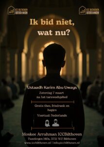 Kom naar de lezing: “Ik bid niet, wat nu?” Aanstaande zaterdag 7 maart na het taraweehgebed, inshaAllah, in moskee Moskee Arrahman in Bilthoven.